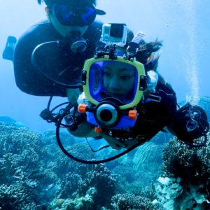 我們使用不需咬呼吸器、可以透過鼻子呼吸的全臉面罩,讓您可以在水中自然呼吸,就像在陸地上一樣。因此,即使您不擅長游泳,也可以在一對一的支援下安心體驗極致的潛水。這款全臉面罩有寬敞的全面玻璃視野,讓您可以寬廣明亮地觀賞周圍的海底世界。